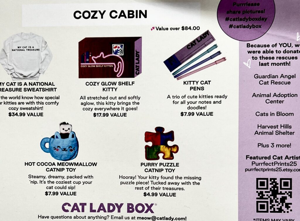 The January 2026 Crazy CatLadyBox was nicely curated for the Cozy Cabin theme. You can wear your soft and warm new sweatshirt under the calming lavender glow of your new shelf kitten while you pen your Christmas thank you notes to your friends and family. How sweet is that!
