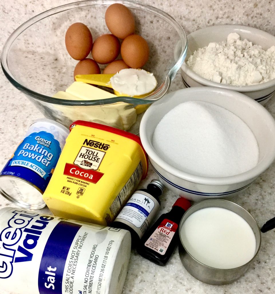 Stir together flour, baking powder, and salt. Add to butter mixture alternately with milk, beginning and ending with flour mixture. Beat at low speed just until blended after each addition. Stir in vanilla. Transfer 2 1/2 cups batter to a medium bowl; stir in cocoa and food coloring.