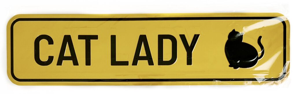 This is a metal yellow and black Cat Lady Crossing sign for your yard, door, office, or anywhere you want stake your cat lady claim to the world! And extra credits if your cat/s are black, too!