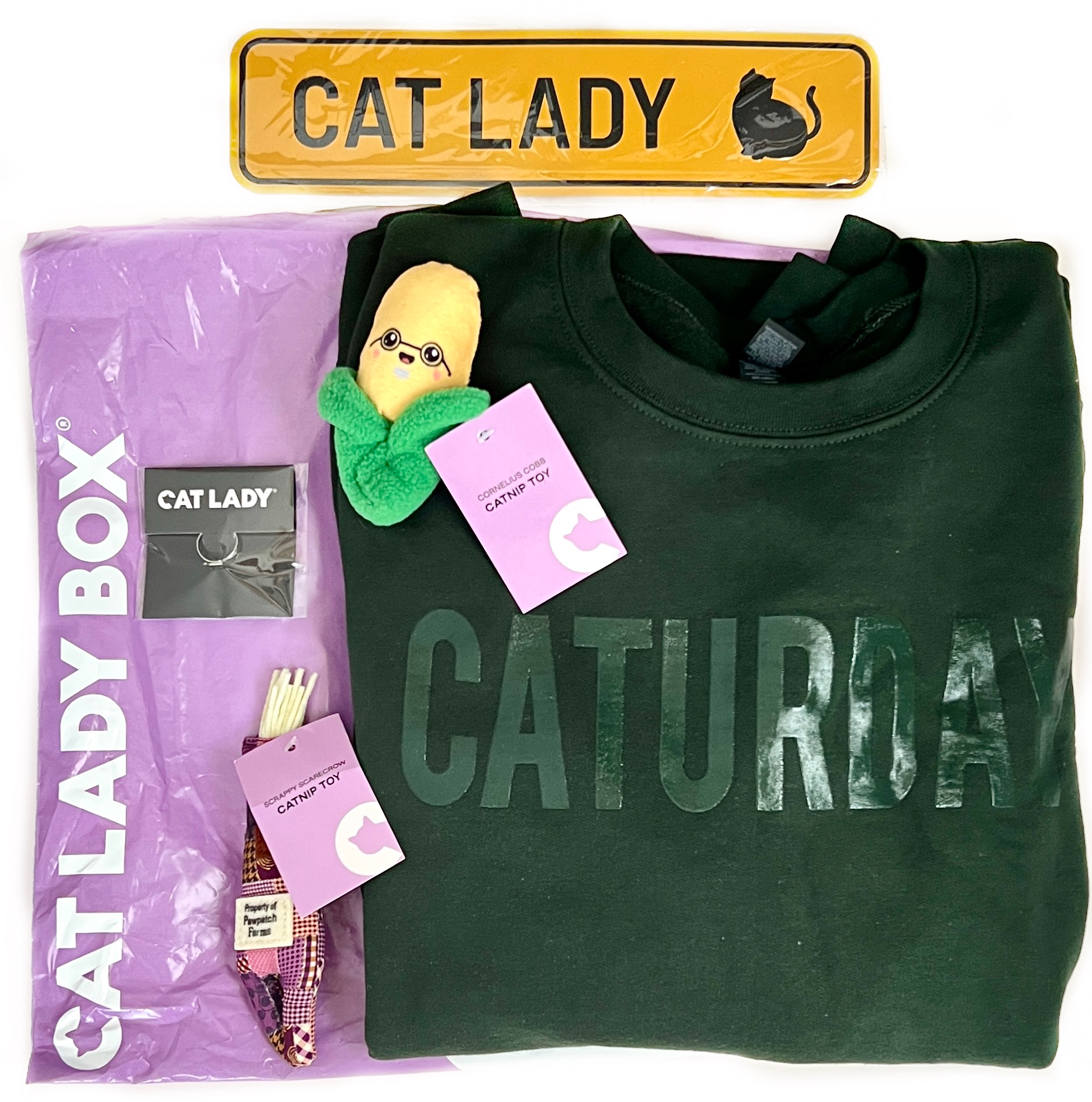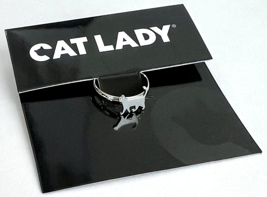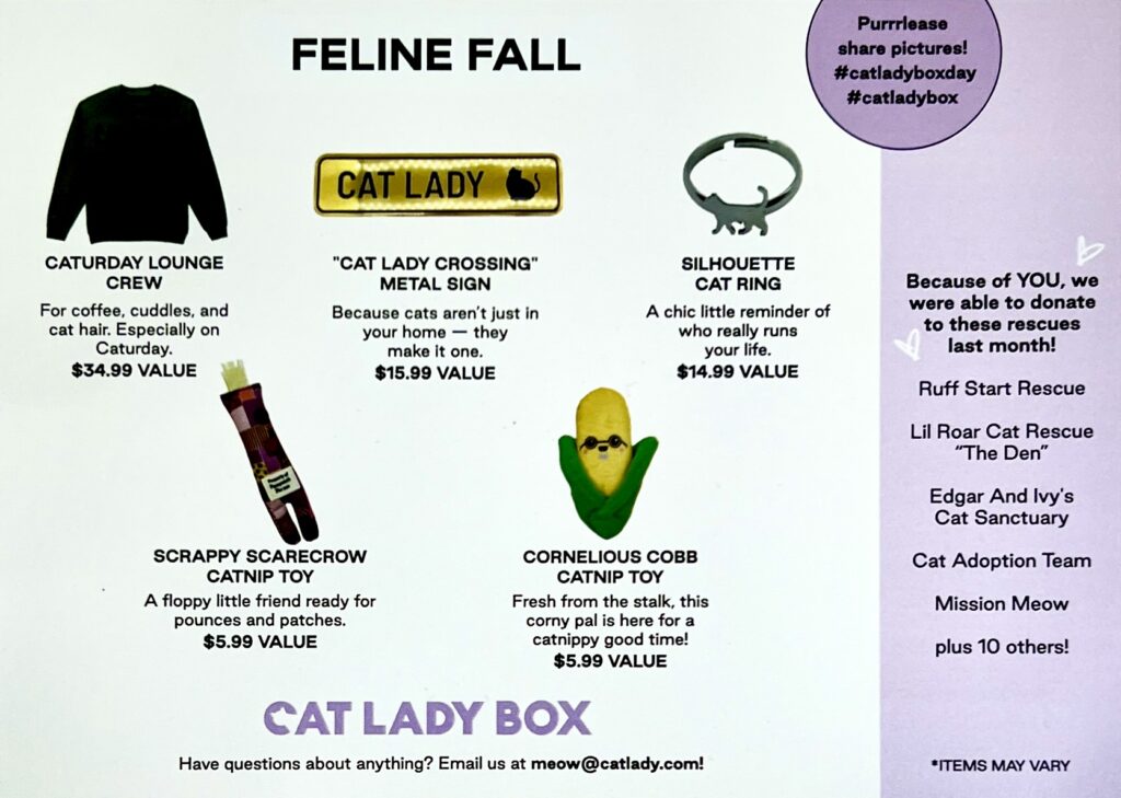 The September 2025 Crazy CatLadyBox was Feline Fall themed and had a really warm dark green Caturday sweatshirt that will be a go-to shirt for me this season! The box also had a very sweet kitty ring and a metal Cat Lady sign for your space. We received this month’s box in a polybag instead of a box. Included was a note that CatLadyBox is trying out using a bag instead of a box as a cost saving measure when shipping non-breakable items. There was also an apology to our cats for not having a box for them this month and hoping we had an extra box set aside for them from previous shipments! Most upcoming shipments will continue to arrive in boxes, though.