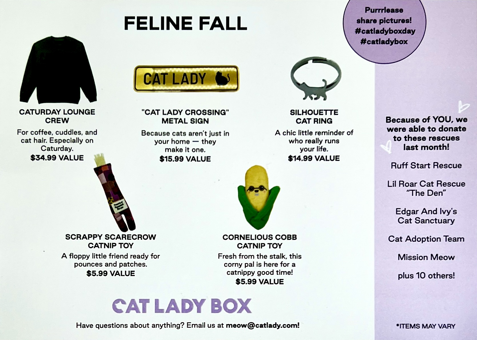 CatLadyBox donates 5% of all profits to a different cat rescue organization each month plus supports independent artists and small businesses with their box contents.