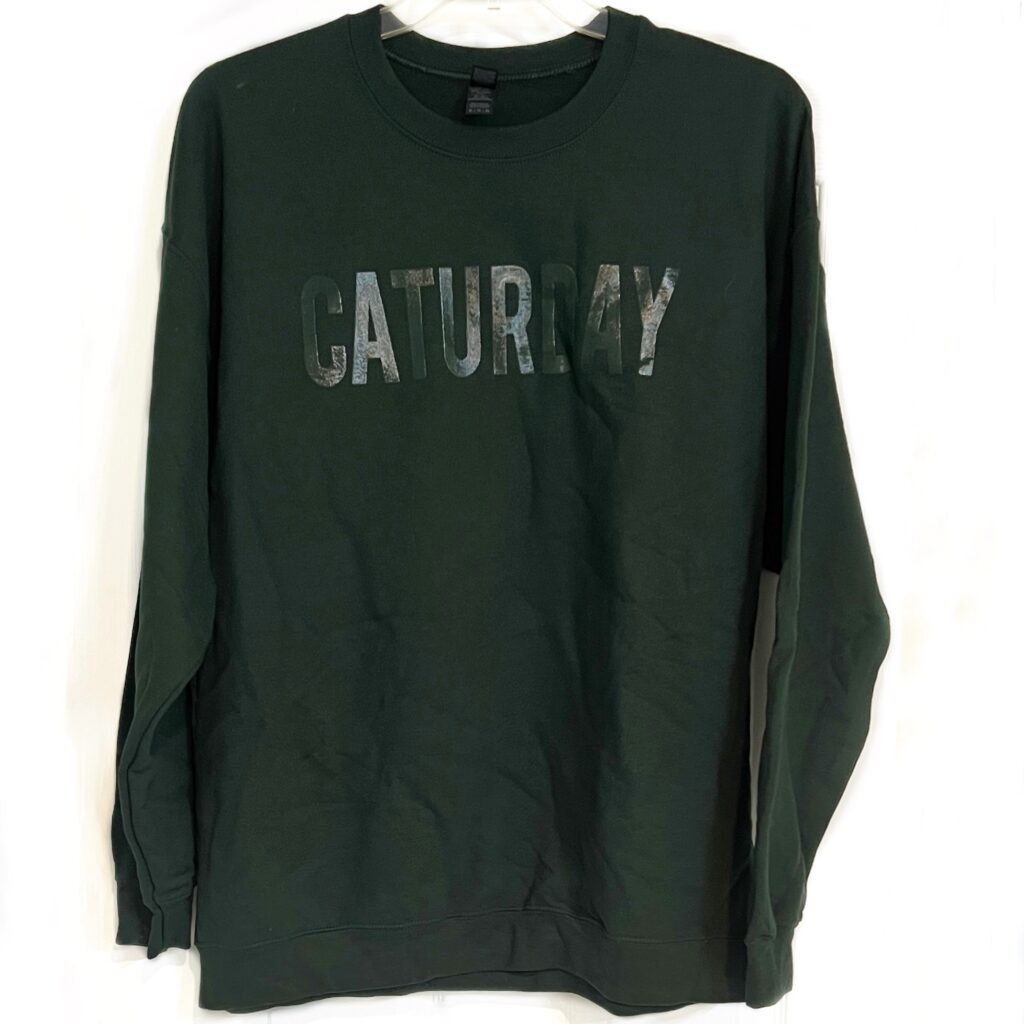 Caturday is my favorite day of the week. If you are planning to relax at home with your cats or go to an outdoor event, this heavy duty dark green crew neck sweatshirt will keep the chill out of your bones!